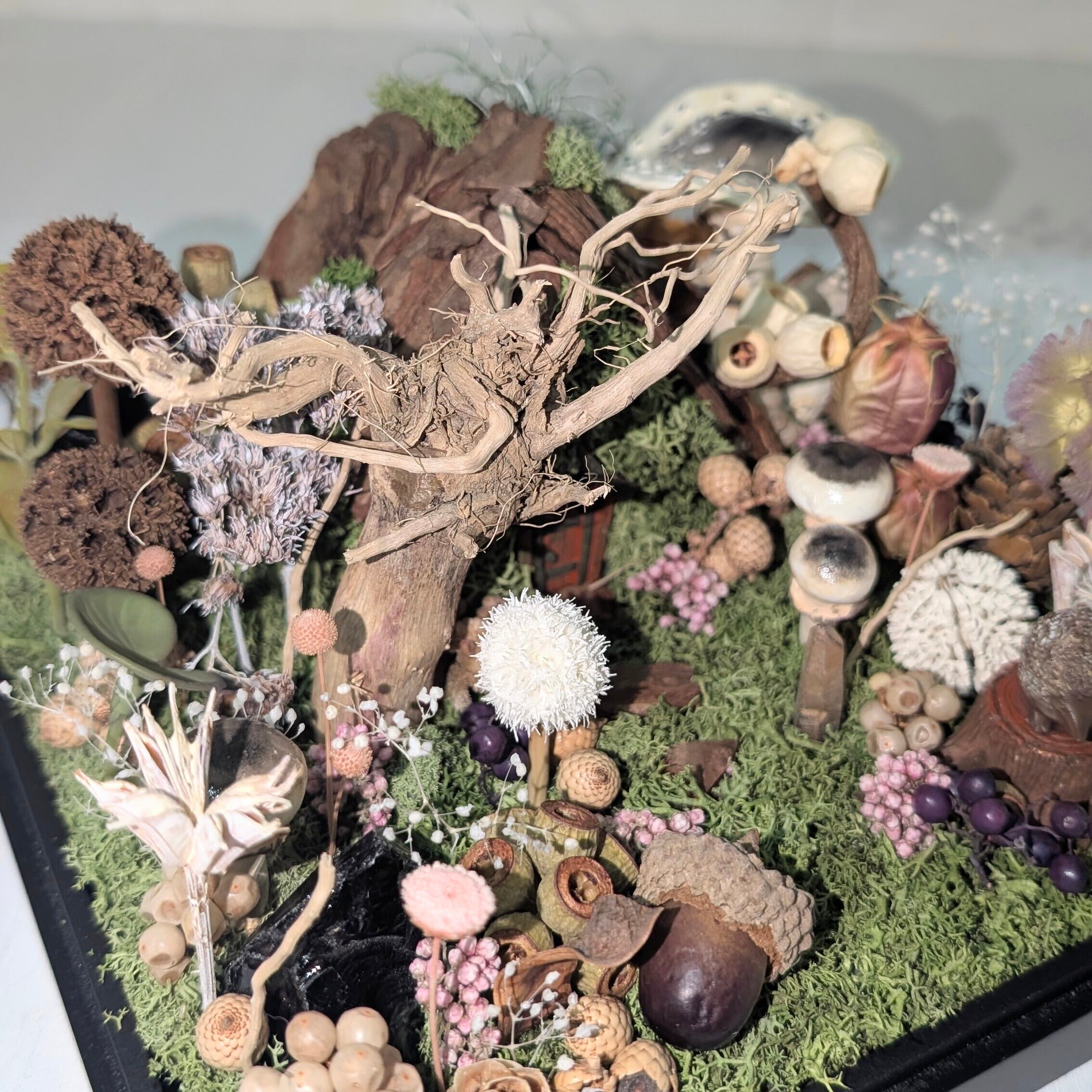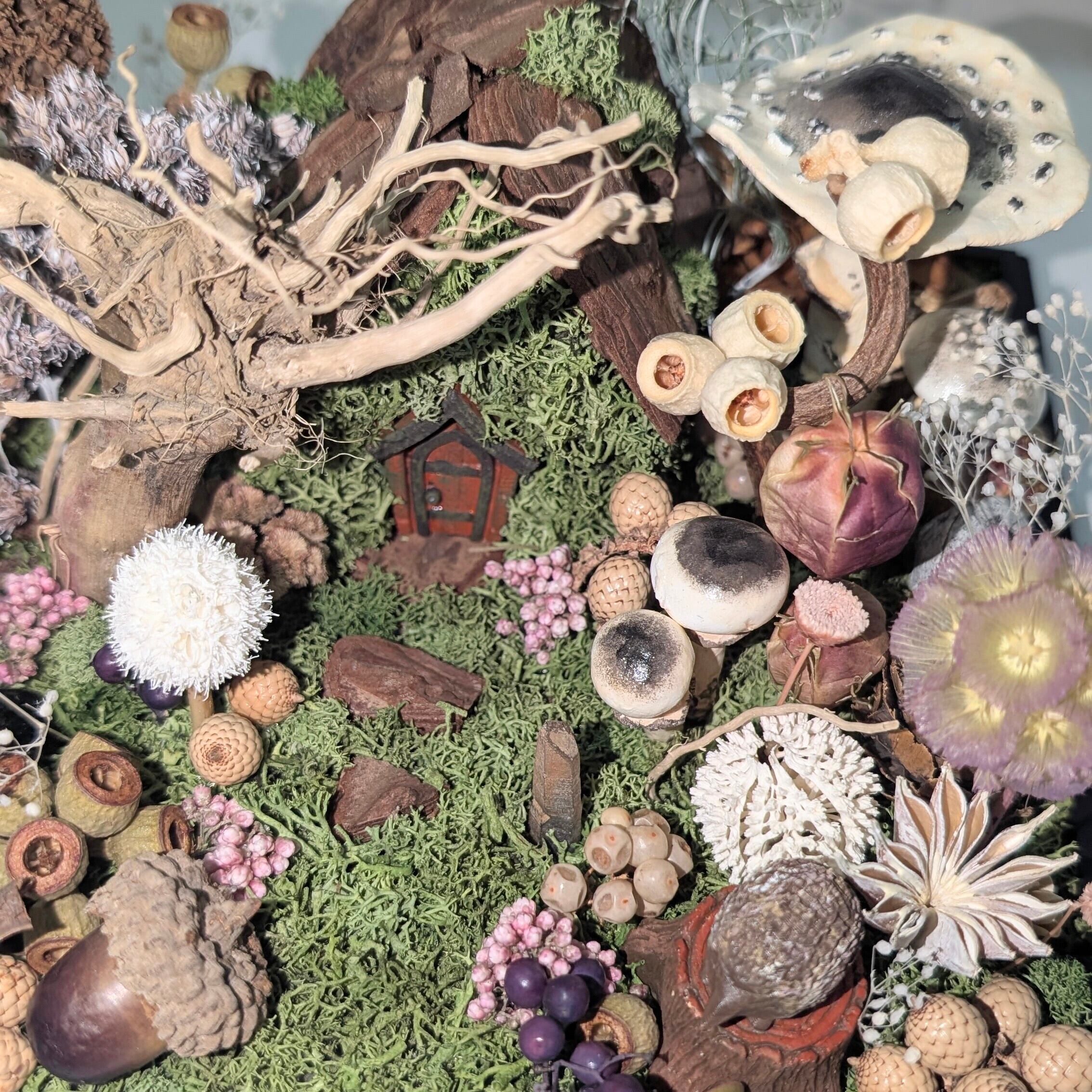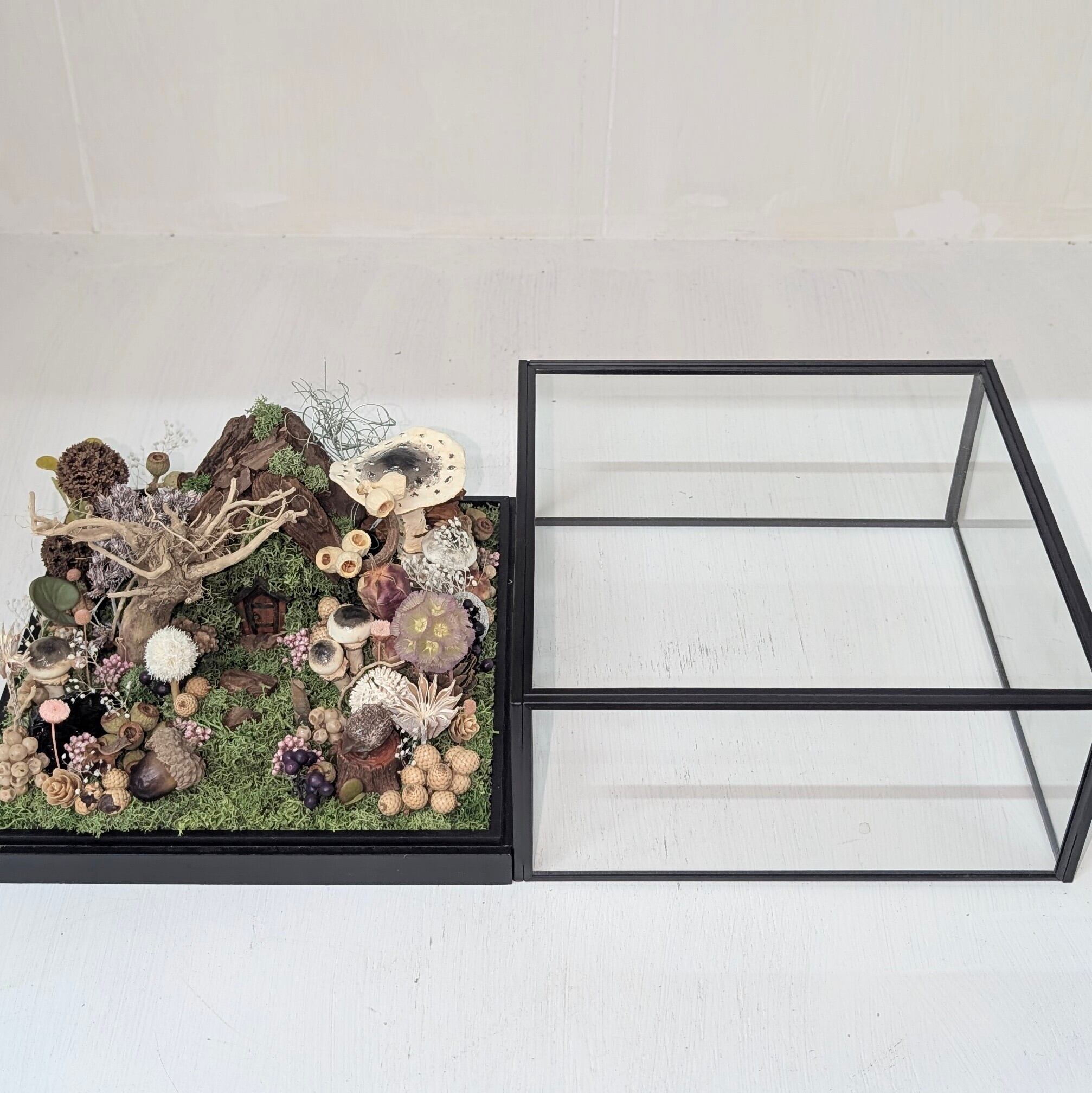 キノコにみたてたプリザーブドフラワー、ドライフラワー、石粉粘土等を使った商品となっております。