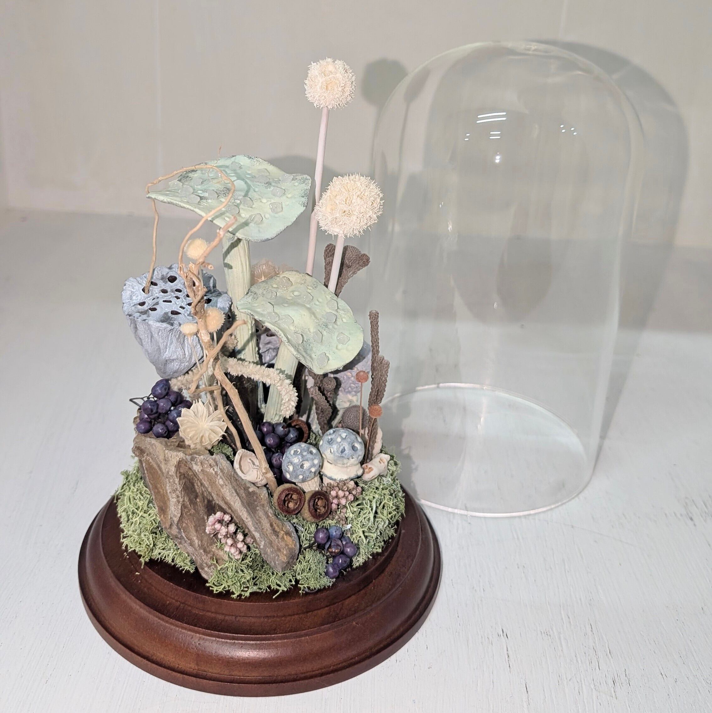 キノコにみたてたプリザーブドフラワー、ドライフラワー、石粉粘土等を使った商品となっております。