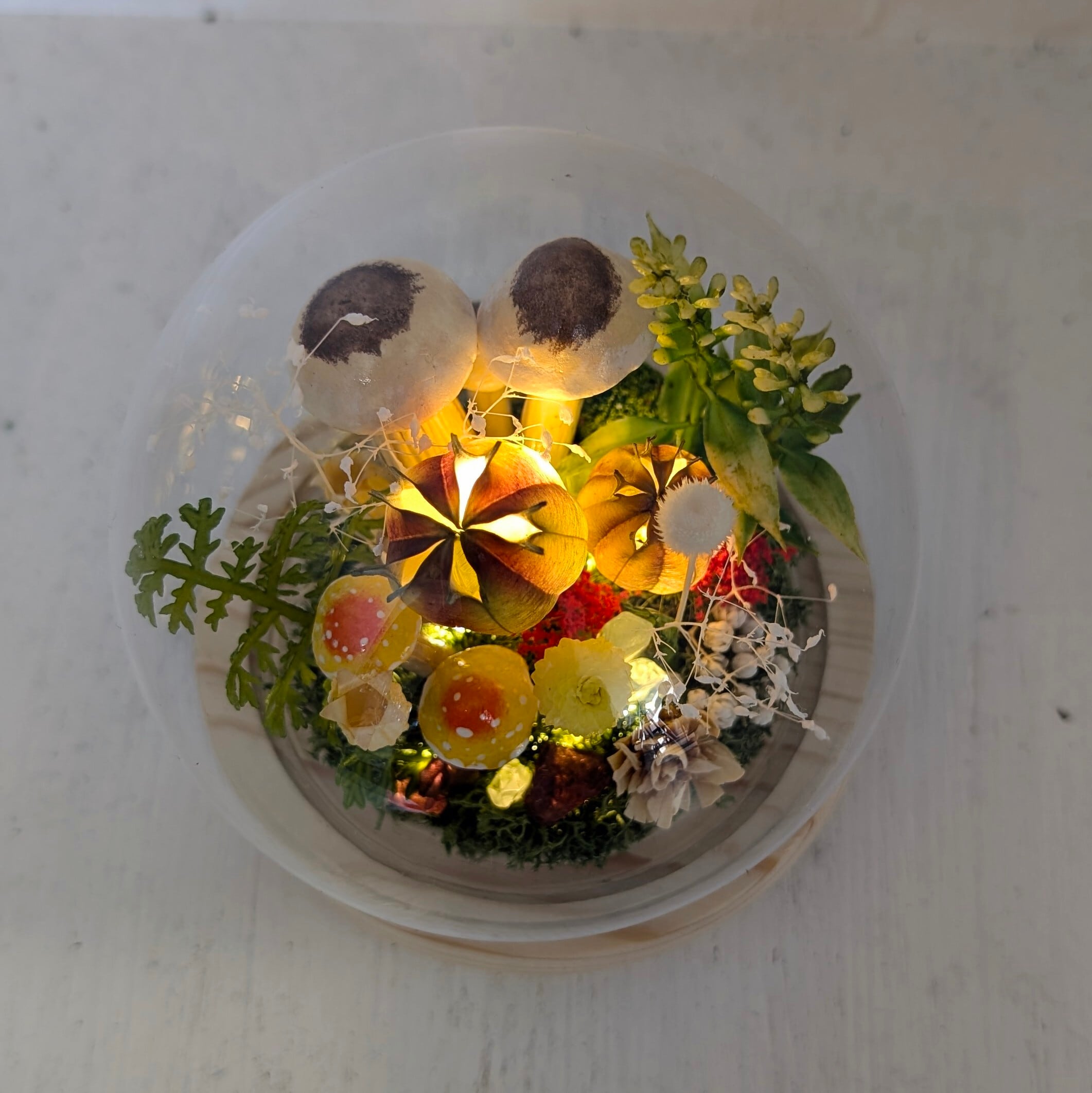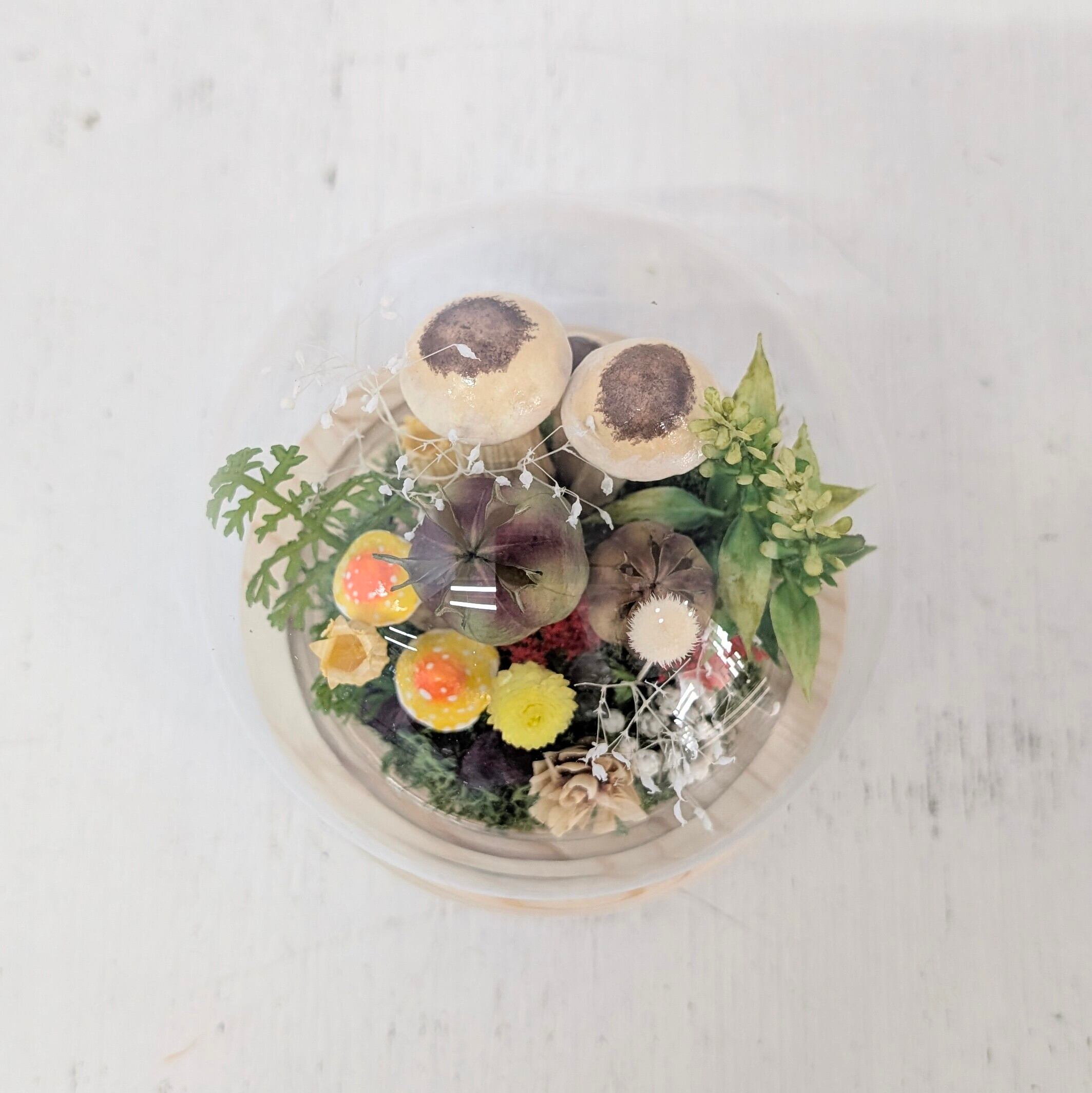 キノコにみたてたプリザーブドフラワー、ドライフラワー、石粉粘土等を使った商品となっております。