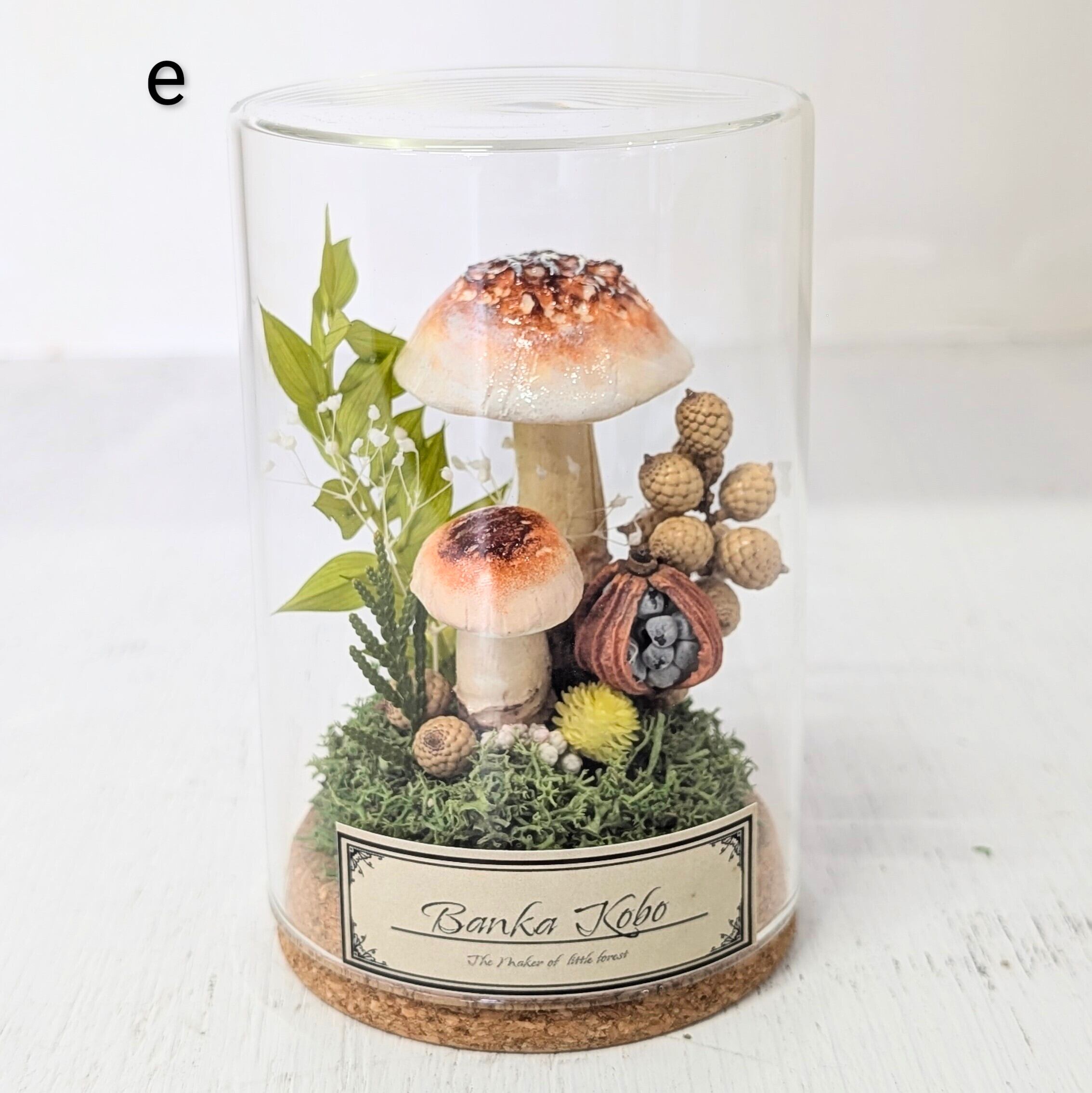 キノコにみたてたプリザーブドフラワー、ドライフラワー、石粉粘土等を使った商品となっております。