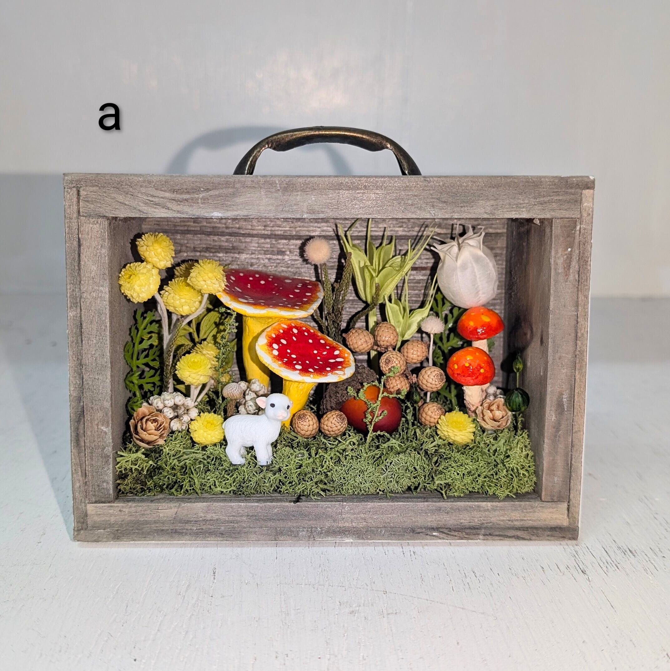 キノコに見立てたプリザーブドフラワー、ドライフラワー、石粉粘土、アーティシャルフラワー等を使った商品となっております。