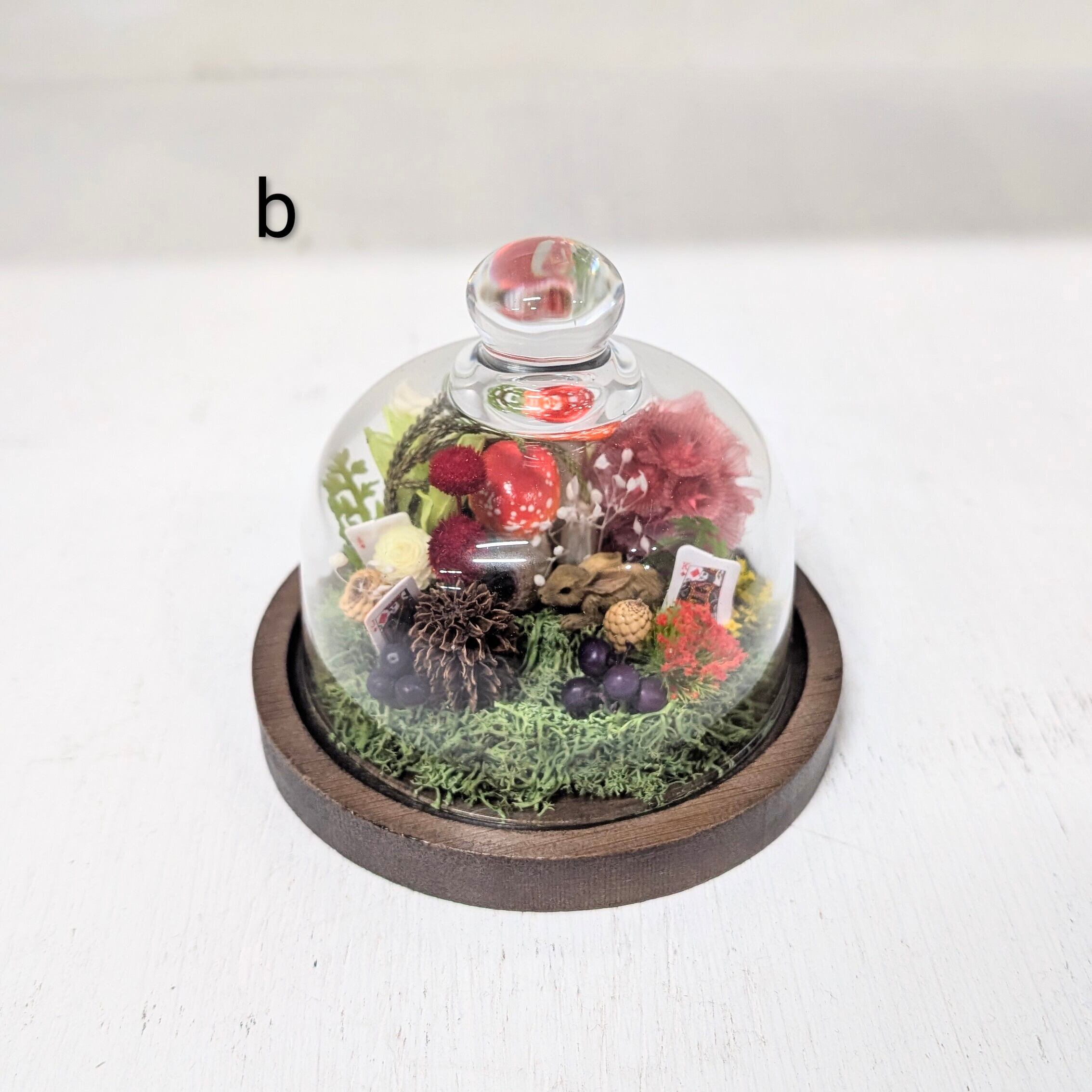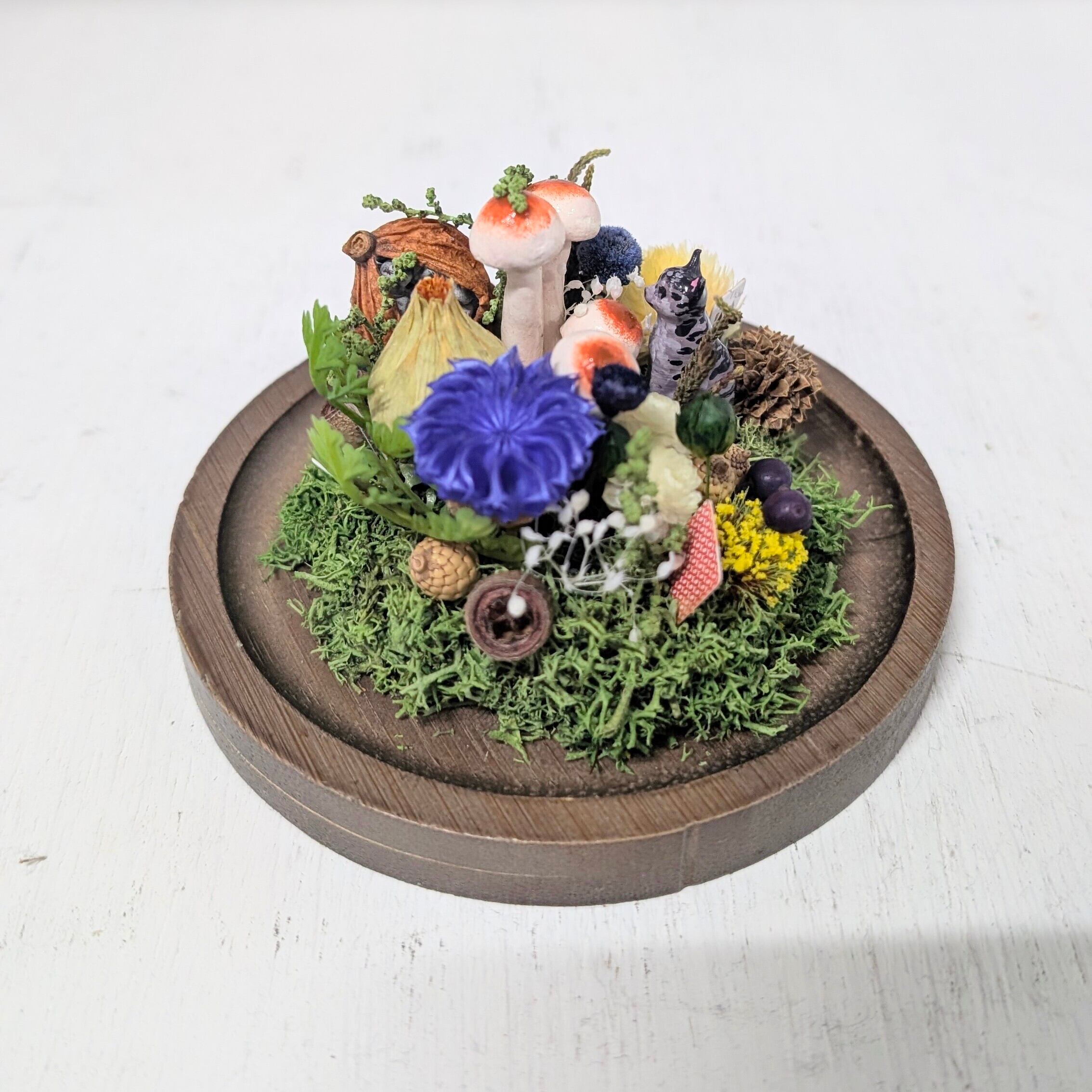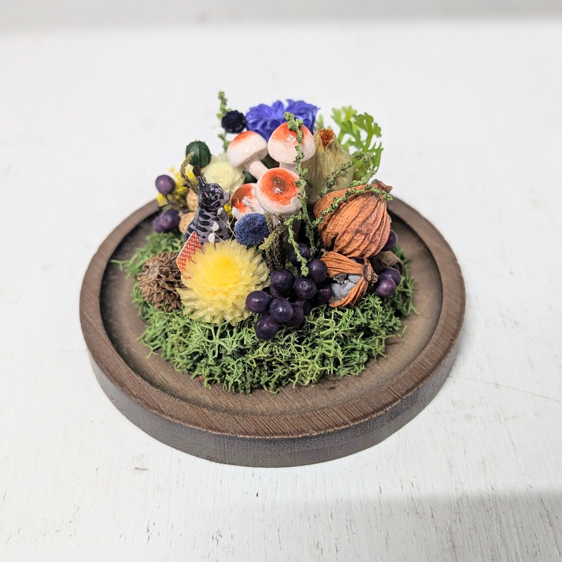 キノコにみたてたプリザーブドフラワー、ドライフラワー、石粉粘土等を使った商品となっております。