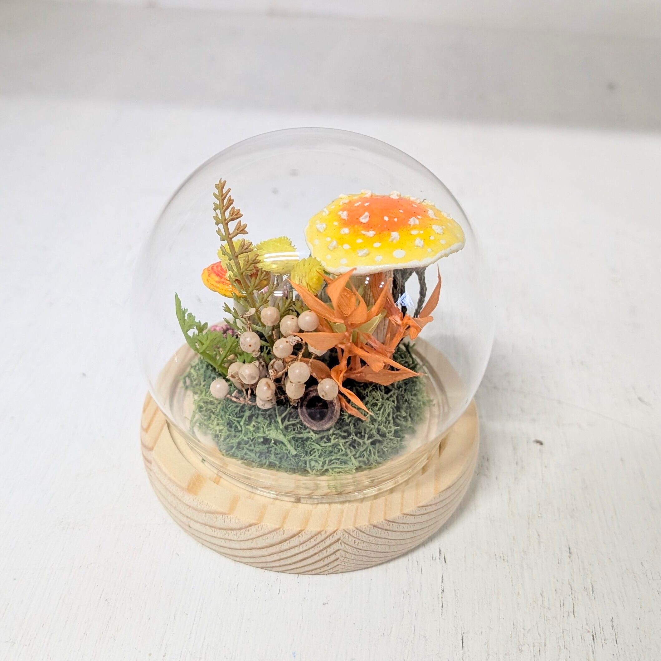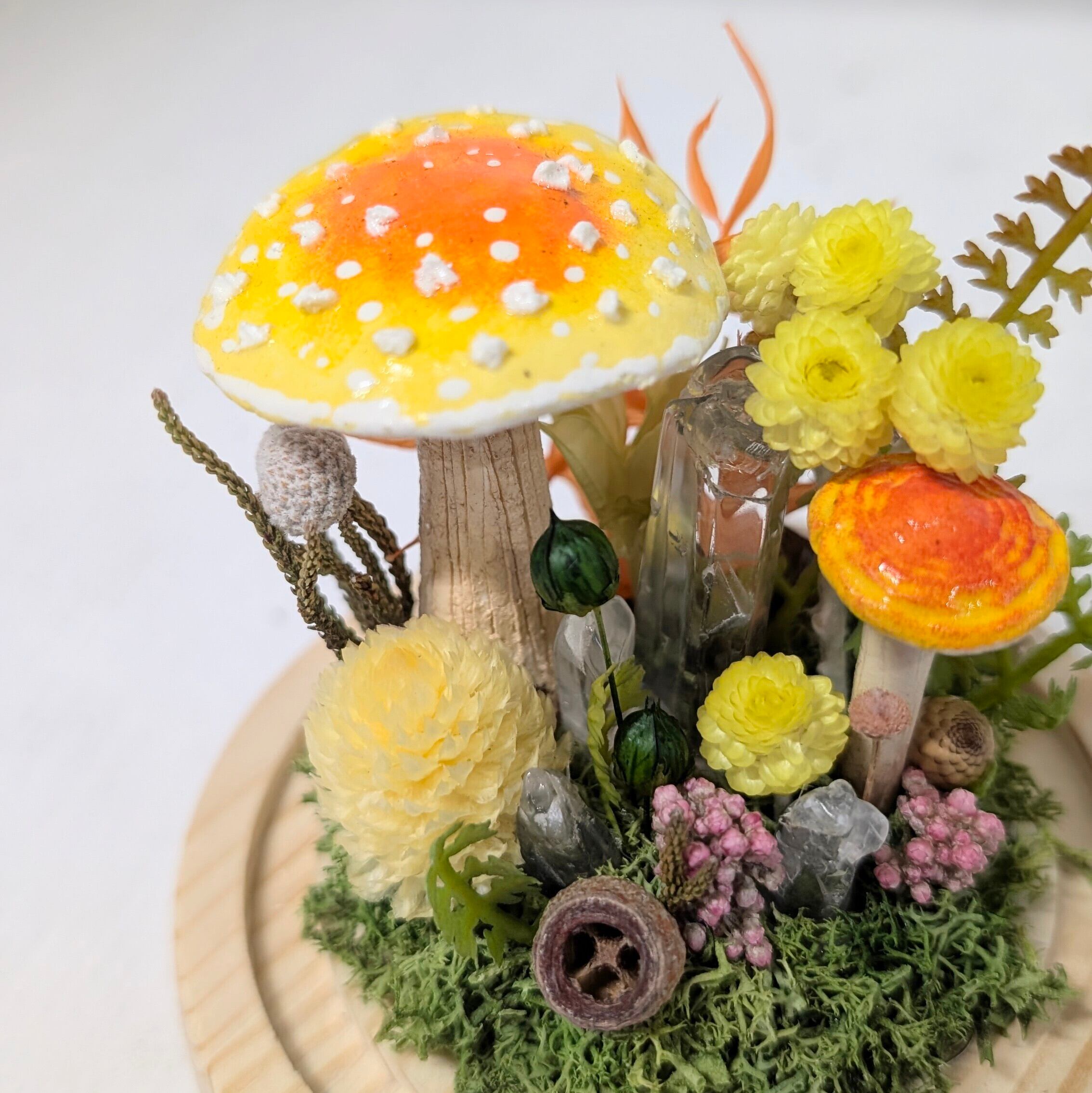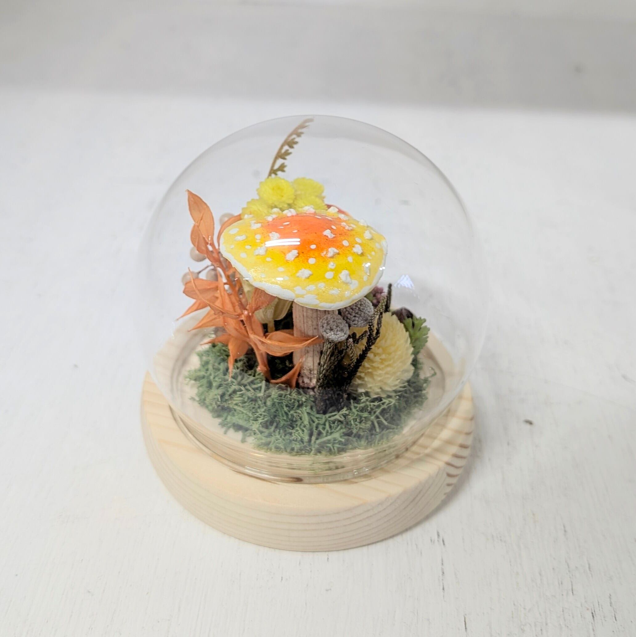 キノコにみたてたプリザーブドフラワー、ドライフラワー、石粉粘土等を使った商品となっております。