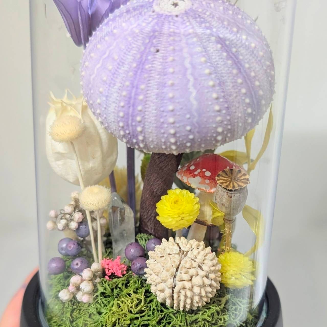 キノコにみたてたプリザーブドフラワー、ドライフラワー、石粉粘土等を使った商品となっております。