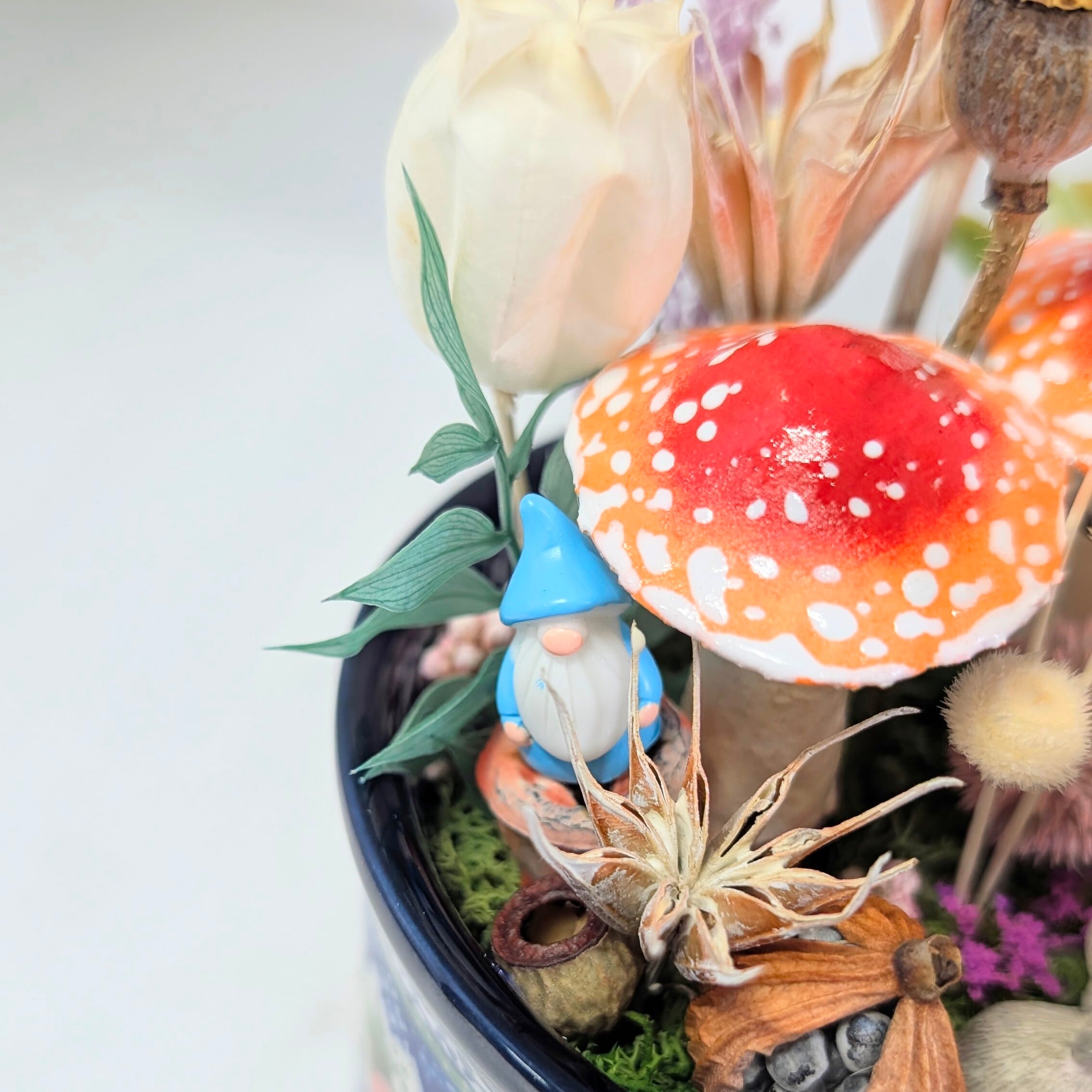 キノコにみたてた石粉粘土、プリザーブドフラワー、ドライフラワーなど使った商品となっております。